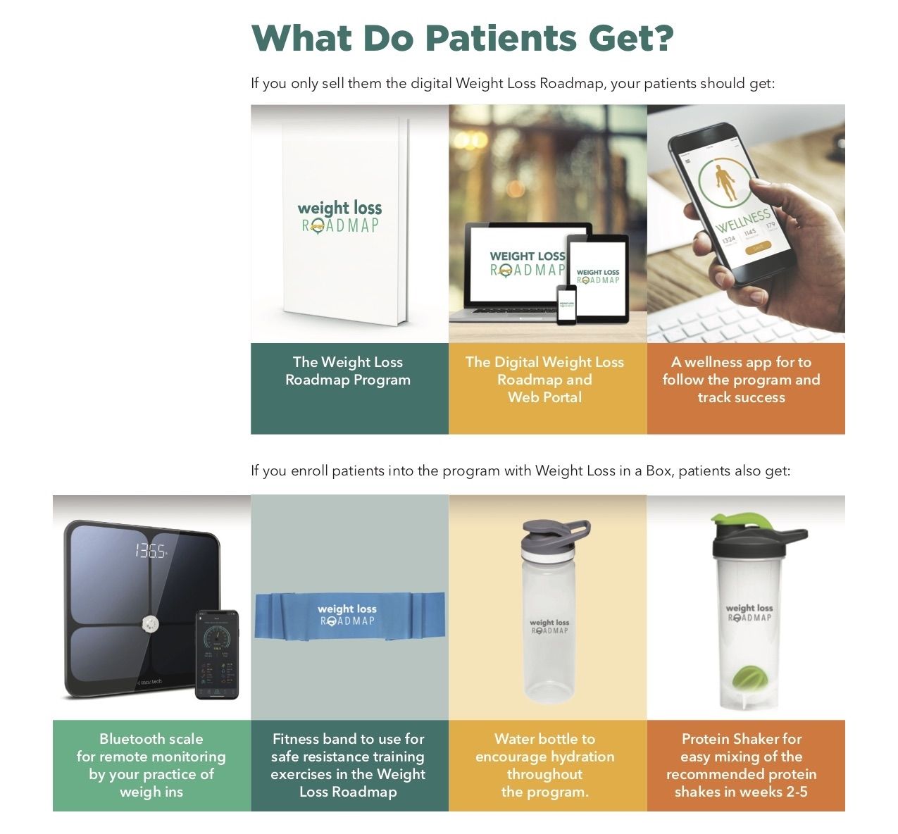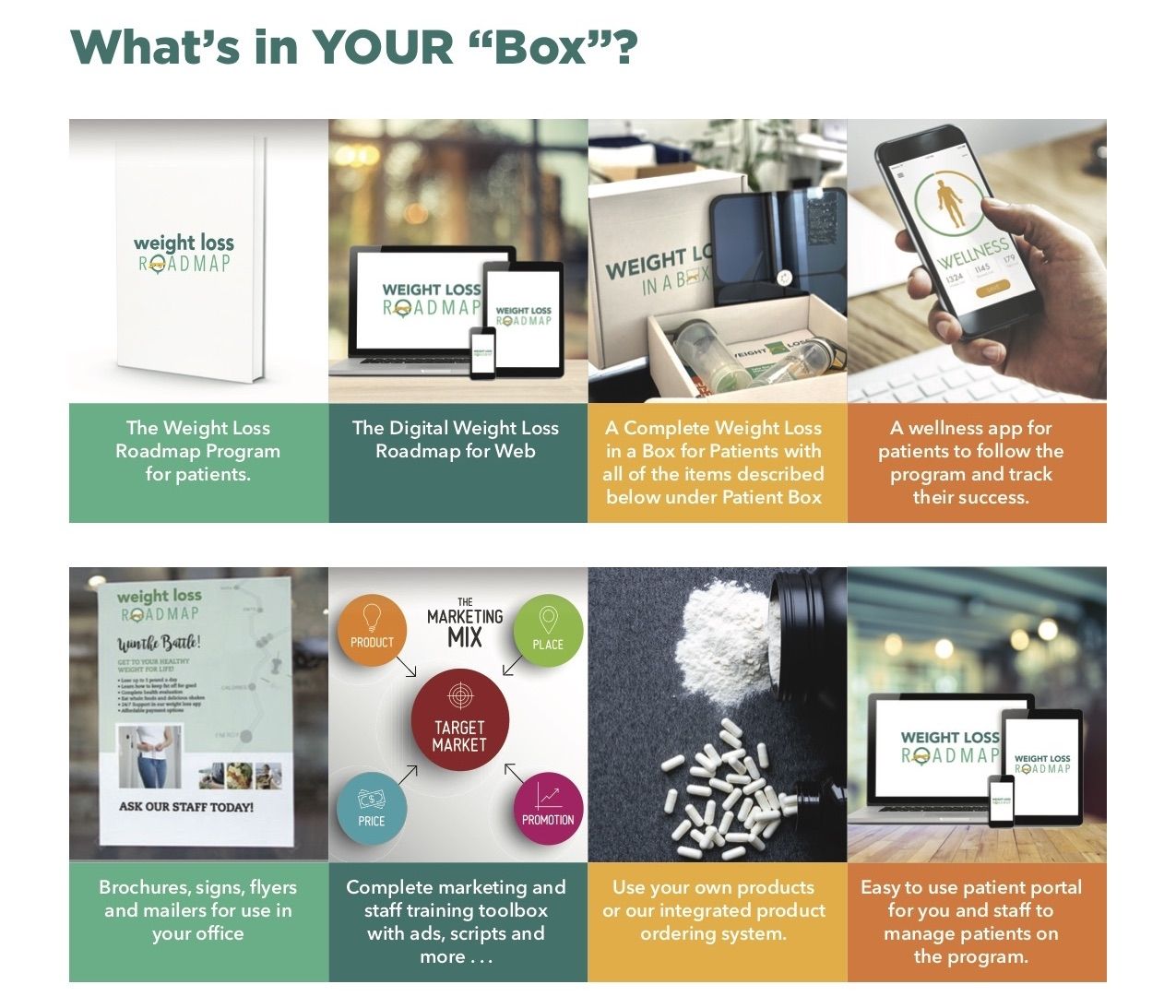 Weight Loss in a Box™ includes the patient-facing weight loss program in both printable and digital form, a powerful but easy to use patient portal for the patient and your team, advertising, marketing and sales tools for you to use right away and even the pricing and sales frameworks to make this all come together seamlessly.